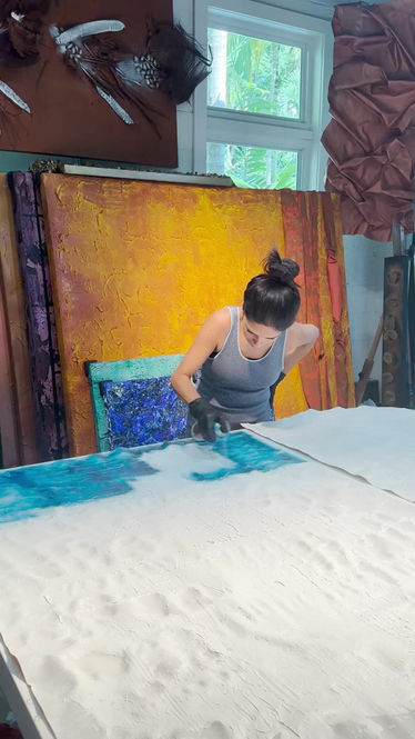 “For me, creating art has to have a consistency. It is by mixing acrylics, spray paint and chalk that I turn my canvases into something beautiful. For each work, a new idea, a new passion. My inspirations visualize emotions and all the situations around me into art. I have found that bringing art into my life is like turning hard feelings into a refuge, as a woman, a newfound courage, a healing process. The intention has become clear: to add life, charm, good energy and happiness to the spaces of those who have welcomed me into their lives through my art. I do this with love.”