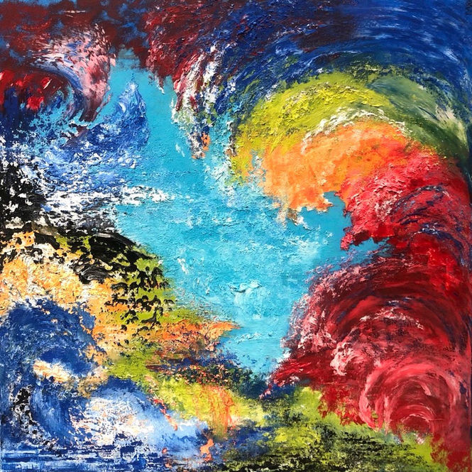 TITOLO: Movimento primordiale e perenne DIMENSIONI: 100X100 TECNICA: mista su tela CONCETTO: montagne, grotte sotterranee, ruscelli, flutti di mare, fiamme di vulcano e cielo si incontrano e si scontrano, si separano e si fondono in un movimento primordiale che, impercettibile ai nostri sensi, resterà perenne all’unisono con il battito dei nostri cuori.. Artist: DARU