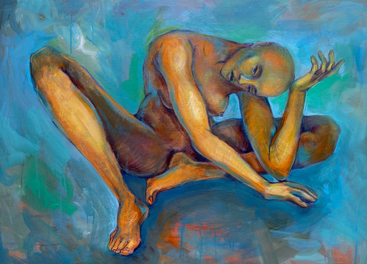 Lizaveta Chapaikina (b. 1998, Minsk) lives and works in Valencia, a city to which she moved in 2021. She began studying academic drawing with a teacher at the Academy of Arts in 2017. She is inspired by her personal experiences, but also finds inspiration in all things around her: people, nature, movies, music. The work nothing is rich in detail and totally unconventional; it would take a long time to fully enjoy it and grasp all the details. What can be grasped at first glance is that there is no standard trend; the work can be viewed from any position. Hieroglyphics, cartoon characters, inscriptions, still life, and animals appear. A man is reading a book, probably The Little Prince - considering the depiction above the pages. The man is faceless, or rather, his face is replaced by that of another man on whose shoulder rests the paw of a black dog. This man's face is covered by a kind of red scar: a smiley made with red paint. The whole finds within the canvas its own balance in the chaos and nothing prevails over the rest in this free and creative flow. The second work exhibited by Lizaveta Chapaikina is the hole, a much simpler work than the previous one compositionally. The light blue color prevails, of which the exception is the brown hair of the main character and his red shorts. The gaze of the man, who is sitting on the ground and supporting himself on his outstretched arms, is lost in the void, pensive and melancholy. Finally, we can see she, the last work on display, with a horizontal progression and starring a figure of a naked woman. The woman is sitting on the ground, floor and background merging into one color: bright blue flecked with orange, green and other shades. The nape of the neck, without hair, rests on the wrist of the right arm, while the left arm is stretched out in front of the figure. The legs like the right arm are also bent and cover the woman's private parts, censoring her nudity.