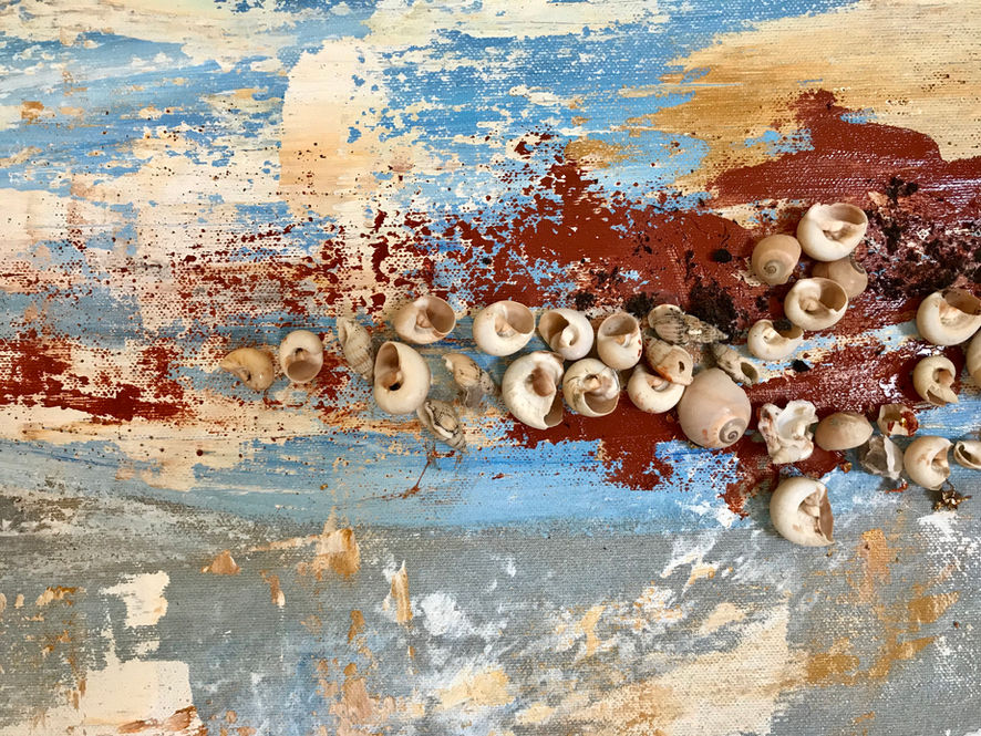 The Beach - 200 x 150 cm - oil and mixed media (shells, pebbles, sand and gold leaves sheets on linen) 2018 Artist: Zeina Nader