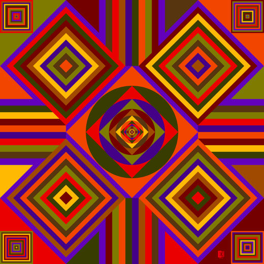 The initial manual skill allowed the digital artist Karin to create, through the use of software designed for art design, abstract works rich in geometric evolutions connected mutually thanks to a vast tonal range, divided between warm and cold areas.