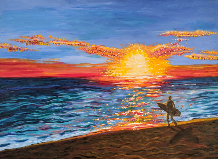 Philip Ryder Dunn once got a history degree from the University of California, Berkeley. Then he received a master’s in journalism from the University of Southern California. He had a career as a journalist, marketing consultant, non-fiction author, and college media professor. One day he opened his eyes a little wider and became a different kind of artist. He sketched his hand, found some canvases in a dumpster, borrowed some oil paints, and proceeded to put down oils in pleasing ways. Now Dunn paints impressions of the ocean and various scenes of wonder. He combines photography and wandering with a forceful push to look closer and see what’s right in front of his nose - which is often scenery that’s very nice. He also writes poems, plays ice hockey and pickleball, and surfs almost every day. He has three teenage children that provide endless delight.