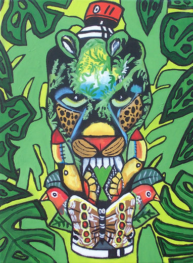 My series of spray can tribal mask paintings was inspired by a workshop I led in my home town of Aberdeen, during which I painted on old spray cans. The suite is an exotic and luxuriant array of tribal masks incorporating elements from African, Asian, and South American traditions. The masks are depicted on spray cans and surrounded by lush patterns of plants and animals. The series has a distinct metropolitan feel and celebrates diversity through a message of unity: we are one species and one tribe.