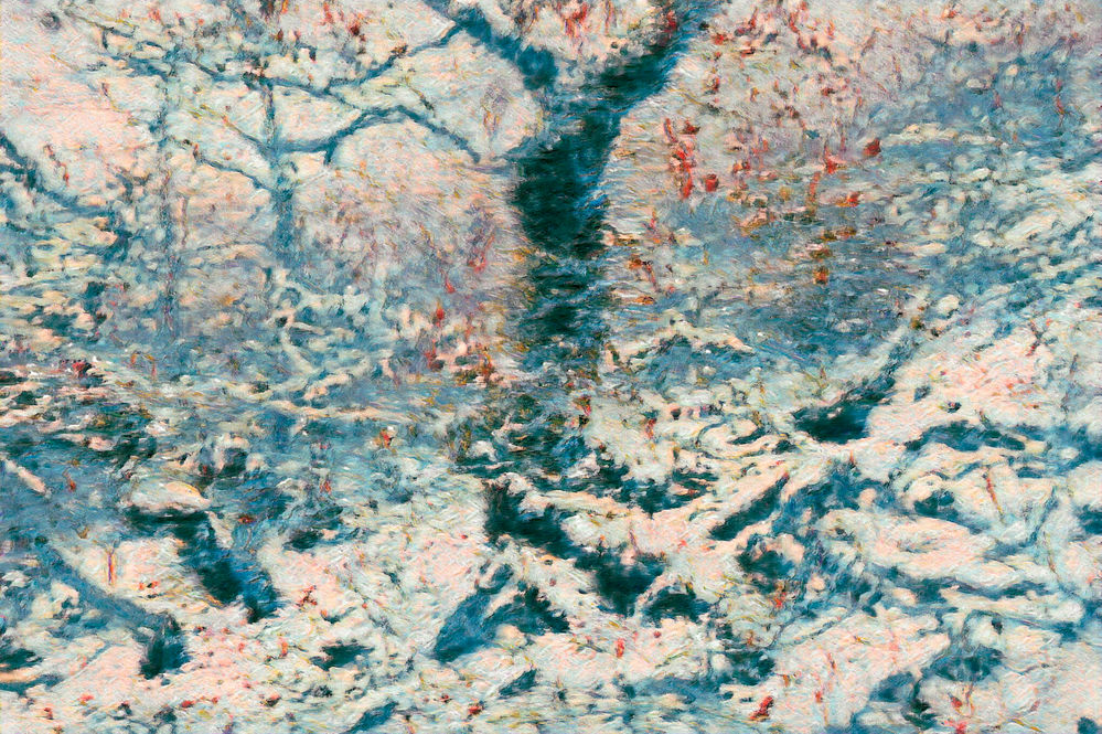 The whole process for every of my painting is divided into three phases, all of them essential and critical for the creation of final work: (1) Photography work process – (2) Digital Painterly Treatment – (3) Final Derivative Painting. Photography Work Process … involves all set of actions from the original shot taken at proper condition of environment in terms of right timing for lights and colors, plus the right place for composition of each frame. The knowledge and smart use of the camera settings, filters, and other photographic gear are key points together with shooting on RAW, which allows me more flexible actions of image editing and assure the high quality of the photograph as a good base of each painting. Digital Painterly Treatment … is the process I follow afterwards and entails a digital work of multi-layers treatment and use of different editing tools for the desired painterly aspect and pixelation. The level of editing depends on each image, as some of them have been mostly produced by camera and requires much less postproduction work. When ready for painting, each work is printed on canvas of 70x100cm (h/w) foam board of 5mm thick. Final Derivate Painting … is the final contribution to each piece for which I use different sets of brushes, fingers, cotton swabs, and airbrushes, plus Liquitex and Gel medium with all acrylic paints, by selecting the proper mix and colors combination for each high or low level of detailed or texturized areas.