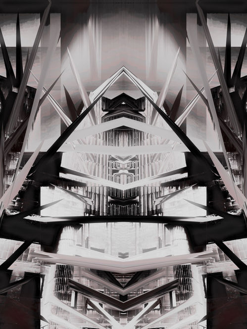 Technique: Urban photo inverted in negative, multi mirror reflection, symmetry, pixel sorting.