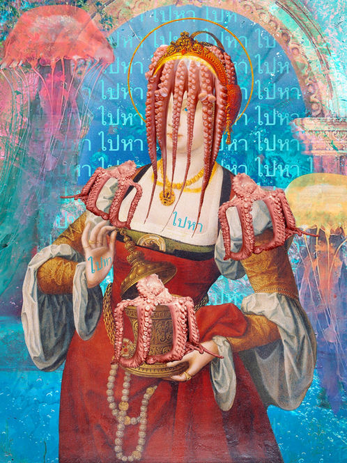 A collage of a dream I had in the spring of 2022. I dreamed that I was wearing an octopus I had caught on my head and muttering "pai har".