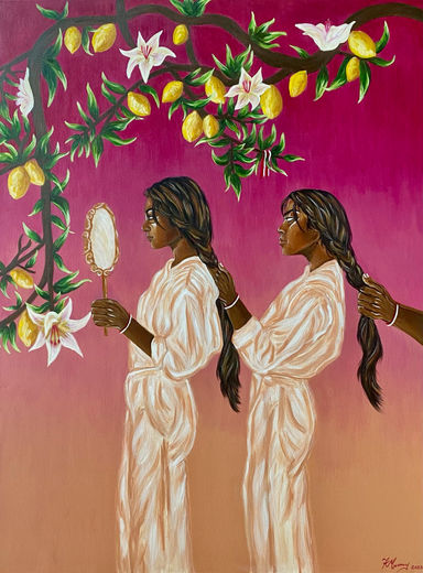 Tayhe Munsamy was born and raised in Johannesburg, South Africa. She attended Gold-smiths University of London where she studied Fine Art and History of Art. During her time in London her practice evolved to showcase works within the realms of speculative thinking, fiction, mythology and folklore. Her practice weaves together her identity as a mixed-race woman and explores elements from the Coloured and Indian communities in South Africa. Storytelling that combines cultural specificity and historical archives with fictional features are evident in her work in written and visual forms – paintings, video, performance, and digital media – to unveil themes of construction, displacement, transformation, and fantasy in relation to notions of the self.