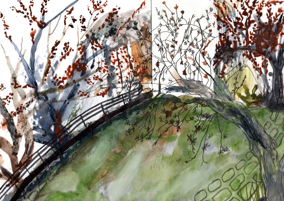 Technique: Watercolors, pen, and collage on paper. The piece was created in two parts – the first layer was created during winter with the grey bareness of trees upfront & visible and the second layer was created in the spring as leaves started to sprout, adding to the beauty of these trees.