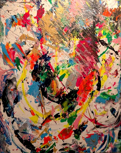 From the very beginning, she chose to paint with her palms, allowing her heart and soul to flow directly onto the canvas. Her works capture the emotions and energies of the moment, expressed with raw sincerity and intuitive gesture.