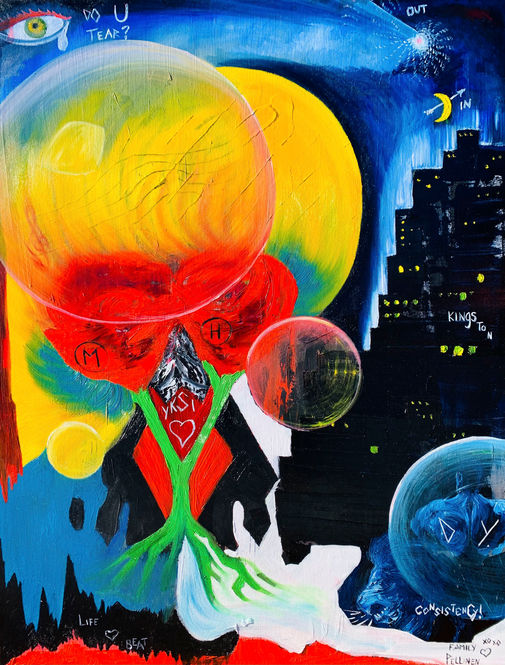 HEAL 89x116CM year2021 Water based oil color painting. Made with brushes and art knives. Painting about my past life, sad moments, happy moments, my idols and influencers, family, I tried to connect to the whole universe with this painting. This painting is about to heal every wounded person who looks at it. I cried a lot doing this.That is my thought and I´m serious about it and hoping it would happen to all who struggle in life. Artist: Hermanni Pellinen