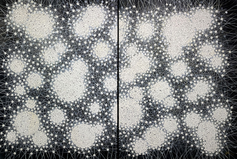 Kim’s work focuses on the increasing popularization of ‘emoticon’ pop-imagery in the past dec-ade. Known colloquially as ‘emojis,’ they are vehicles of individual emotional expression and their universal and semantically rich nature allows us to transcend cultural and linguistic barriers. She begins by drawing clusters of emoticons portraying different states of mind. She then over-laps and connects them to form a unified larger image. Her message is simple; despite every-one’s uniqueness and differences, balance and harmony can be achieved in human relationships.