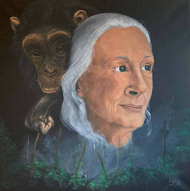 In my picture I portray this impressive woman together with the animals she loves so much. At the same time I show her greatest discovery, a wild chimpanzee that uses tools. The proof that apes are our closest relatives.