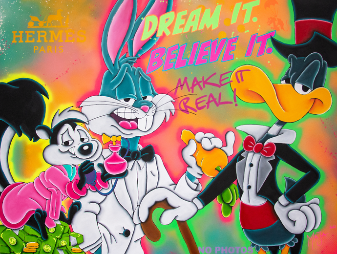 The world of cartoons. The Carinthian artist Mario Jakob Stroitz, alias artmaja©, transports us into a new world with his dazzling works - the world of cartoons. On the one hand strange and yet familiar to almost everyone, his colorful works merge childhood heroes from various cartoon series with astute phrases and subtle remarks in the style of 60s pop art. Maja's works are characterized using different cartoons and cartoon characters. Based on the style of great American modern artists, the commercial templates are individually reinterpreted and charged with personal memories and current events. Special attention is paid to the current elaborate painting technique with which Maja lets his drawn figures look like eye-catching prints. In a multi-stage creation process, the artist “builds” the scenery - using different techniques, layer by layer.