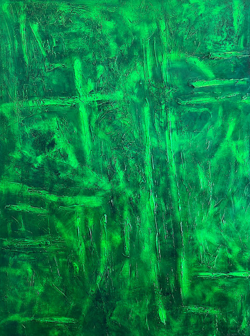 pushed to its limits so that it can be fully appreciated, where nearly neon green shines through the fissions in gestural brushstrokes of opulent emerald green. The former introduces bold passages that